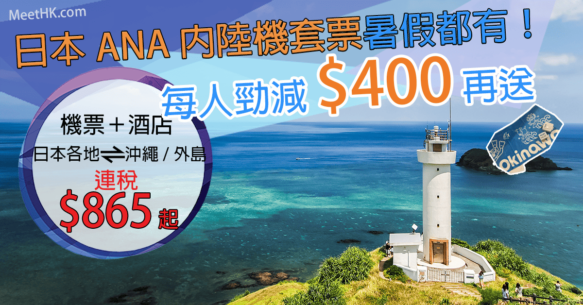減$400後,ANA全日空日本各地飛沖繩/外島(例如石垣/宮古島)來回機票連一晚沖繩/外島酒店套票每人連稅只需$865起