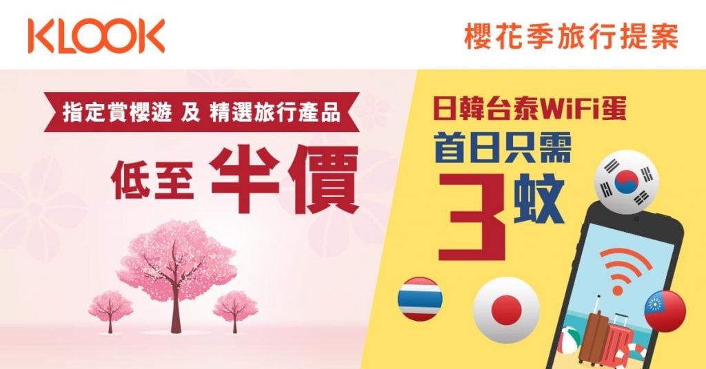 睇櫻花之選!日韓台Wi-Fi蛋首日只需$3,其後每日$12!日韓台賞櫻行程低至5折!東京迪士尼樂園/迪士尼海洋門票只需$480、日本各地JR PASS $534起 – Klook
