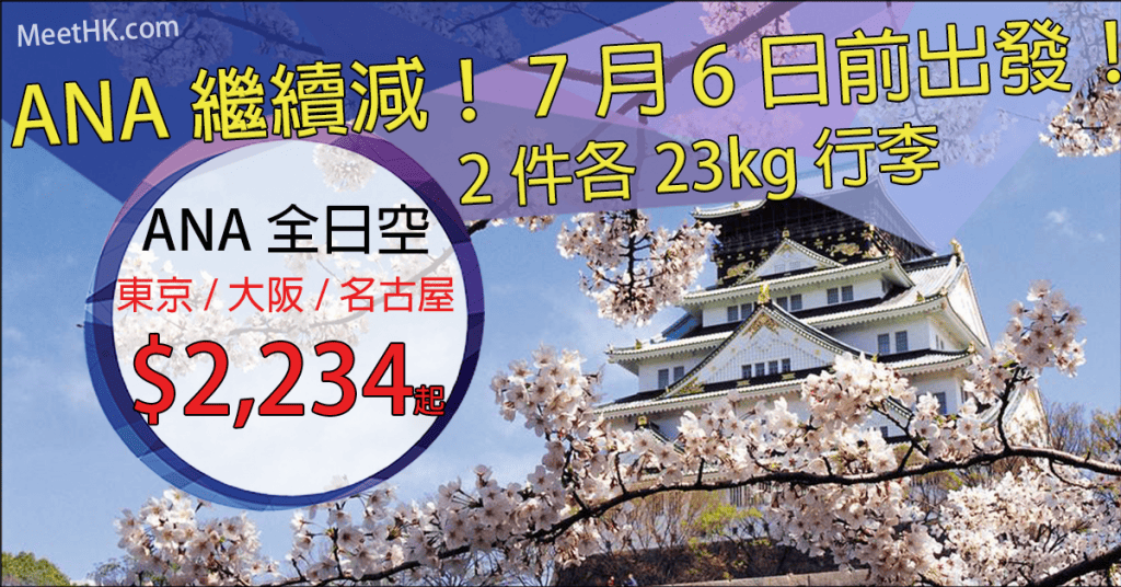 ANA繼續減!兩件各23kg行李!7月6日前出發!香港往返東京、大阪、名古屋只需$2,234起 – ANA 全日空 (優惠至4月17日)