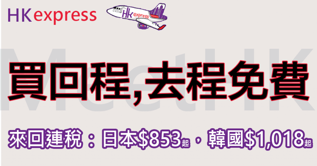 買回程,去程$0!今晚12點開賣!香港飛台灣/東南亞來回$328起,日本各地$598起,首爾/釜山/濟州$598起 – HK Express (優惠至3月23日)