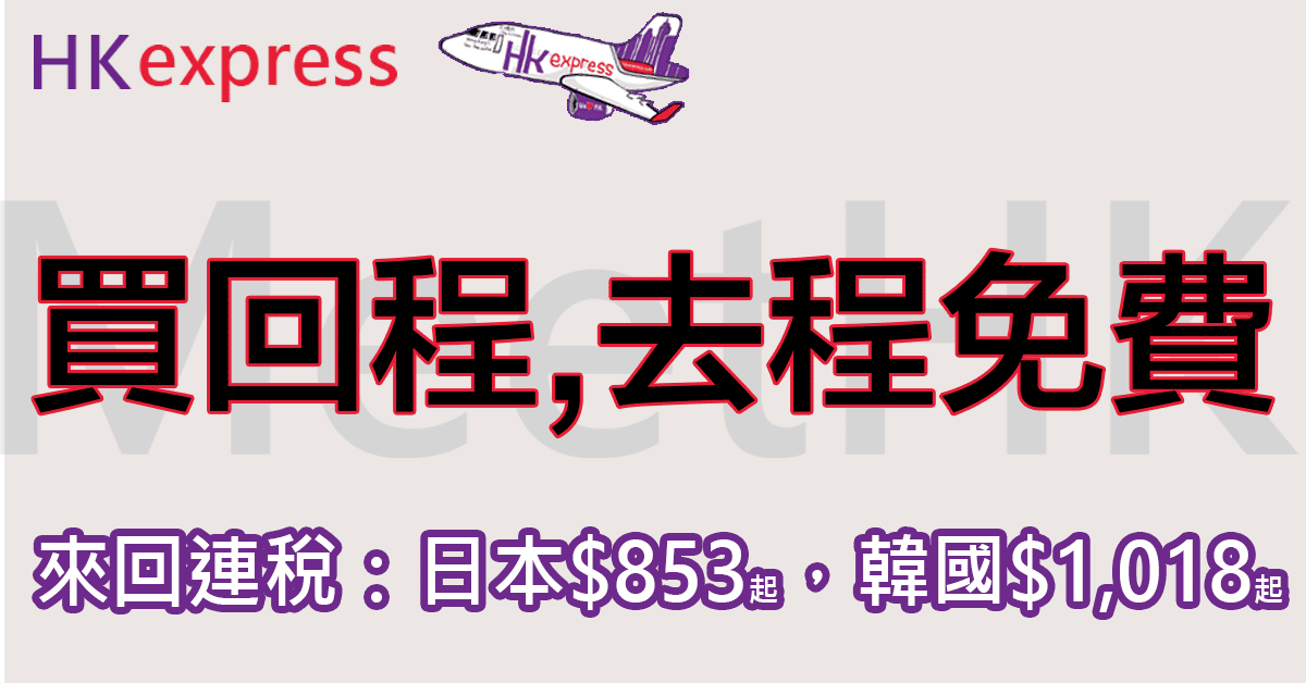 買回程,去程$0!今晚12點開賣!香港飛台灣/東南亞來回$328起,日本各地$598起,首爾/釜山/濟州$598起 – HK Express (優惠至3月23日)