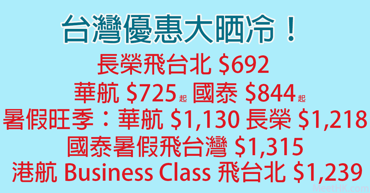 台灣優惠大晒冷!長榮飛台北$692,華航飛台灣$725起,國泰飛台灣$844,華航暑假飛台灣$1,130,長榮暑假飛台北$1,218,國泰暑假飛台灣$1,315;港航Business Class飛台北$1,239 – Wefly.com.hk (優惠至3月25日)