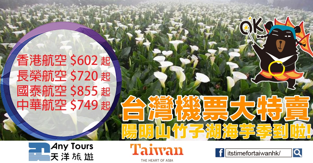 陽明山海芋季到啦!港航飛台北$602,長榮飛台北$720,華航飛台灣$749起,國泰飛台灣$855起 – Any Tours天洋旅遊