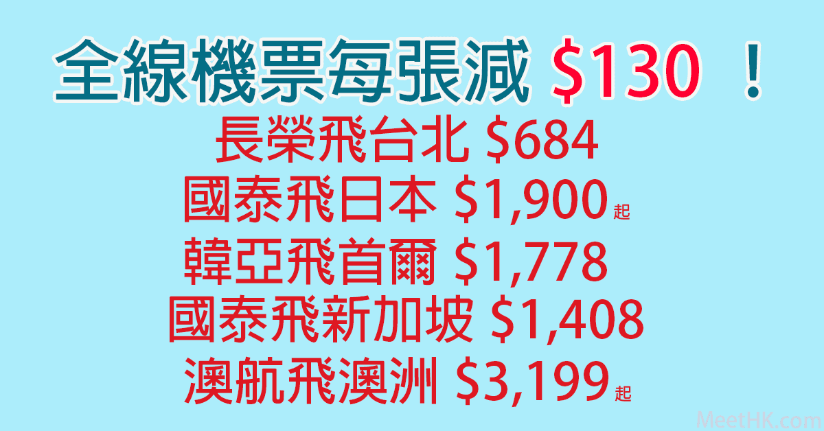全線機票每張減$130!長榮飛台北$684、國泰飛新加坡$1,408、韓亞飛首爾$1,778、國泰飛日本$1,900起、澳航飛澳洲$3,199起、港龍飛峇里島$2,125 – GoGoGo!(優惠至3月29日)