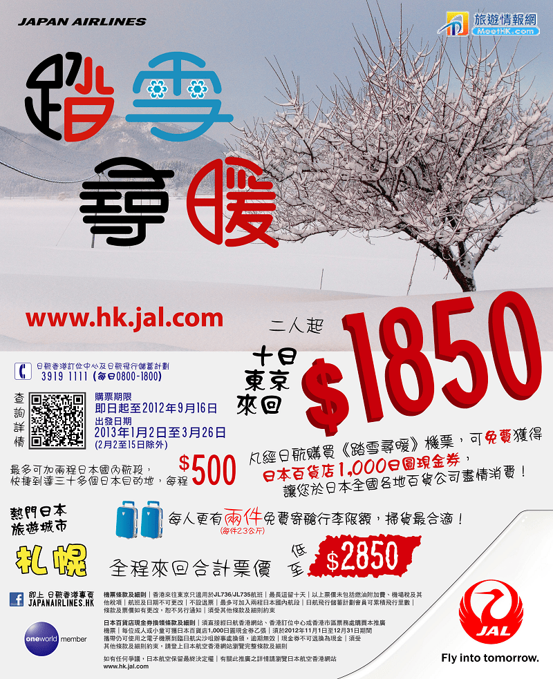嘩!而家先至9月,估唔到日航今日竟然率先推出2013年1月到3月出發既東京機票優惠