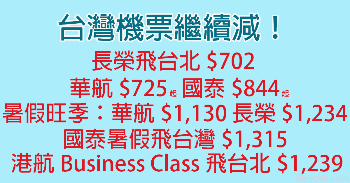 台灣機票繼續減!長榮飛台北$702,華航飛台灣$725起,國泰飛台灣$844,華航暑假飛台灣$1,130,長榮暑假飛台北$1,234,國泰暑假飛台灣$1,315;港航Business Class飛台北$1,239 – Wefly.com.hk (優惠至4月1日)