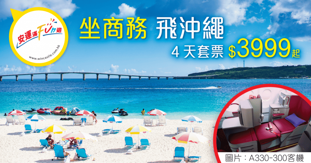 平嘆Business Class飛沖繩!6月30日前出發!港航商務艙來回沖繩4日3夜套票每人只需$3,999起!包30kg行李 – 安運滿Fun遊