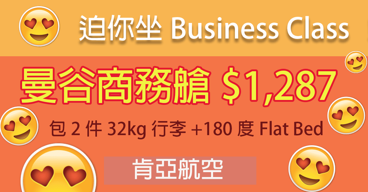 嘩!迫你坐Business Class!包2件32kg行李!香港往返曼谷商務艙二人同行每人只需$1,287 – 肯亞航空 (優惠至4月1日)