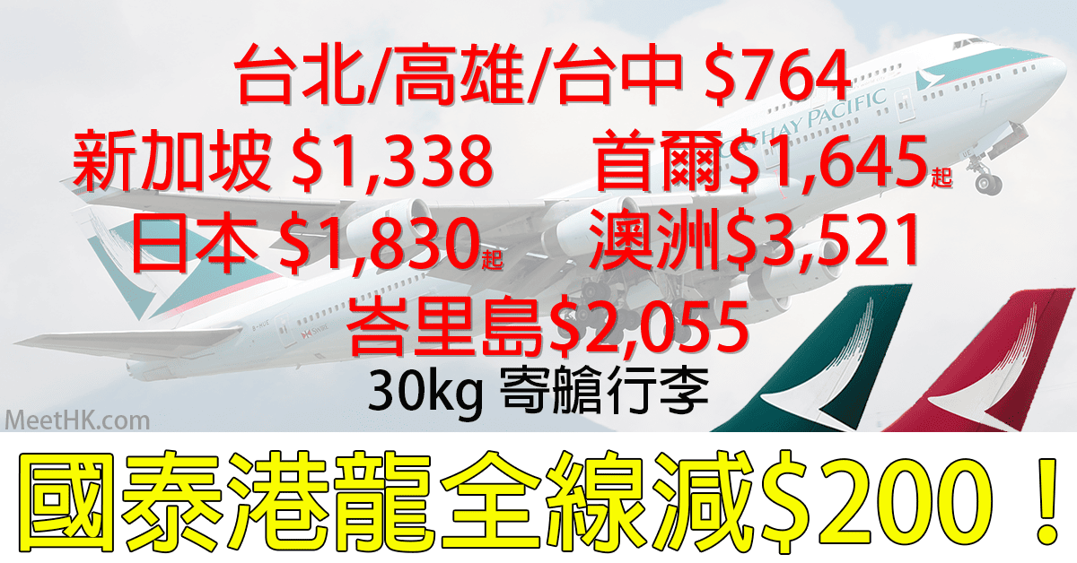 國泰/港龍全線激減$200!30kg行李!台灣$764,新加坡$1,338,首爾$1,645起,日本$1,830起,澳洲$3,521,峇里島$2,055 – GoGoGo! (優惠至4月2日)