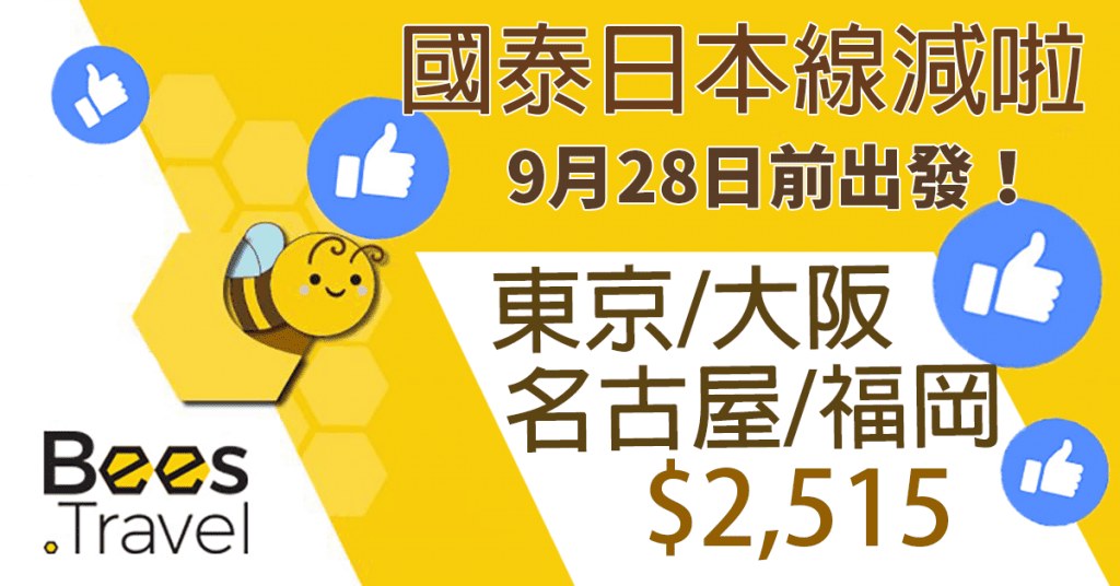 國泰出招!9月28日前出發!國泰飛東京/大阪/名古屋/福岡來回只需$2,515 – Bees.travel (優惠至4月30日)