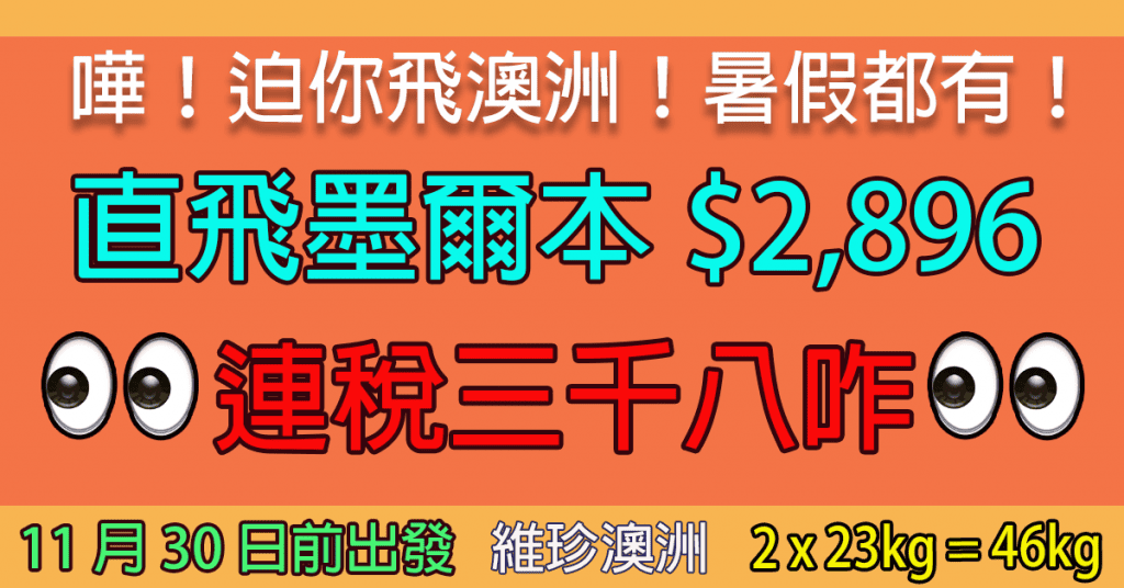 嘩!迫你飛澳洲!暑假都有!連稅三千八咋!11月30日前出發!香港直飛墨爾本來回只需$2,896 – 維珍澳洲航空 (優惠至4月13日)