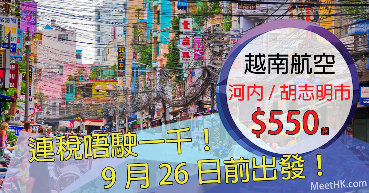 香港往返河內只需$550起,連稅$968起;胡志明市$586起,連稅$964起,連稅唔駛一千蚊!