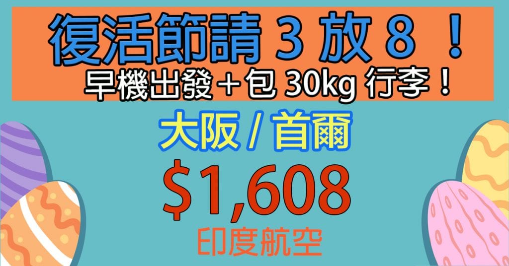 抵呀!明年復活節平飛日韓啦!請3放8!包30kg行李!早機出發!香港往返大阪、首爾只需$1,608起 – 印度航空