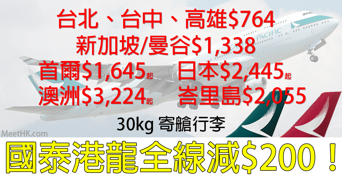 配合GoGoGo!全線國泰/港龍機票每張激減$200優惠