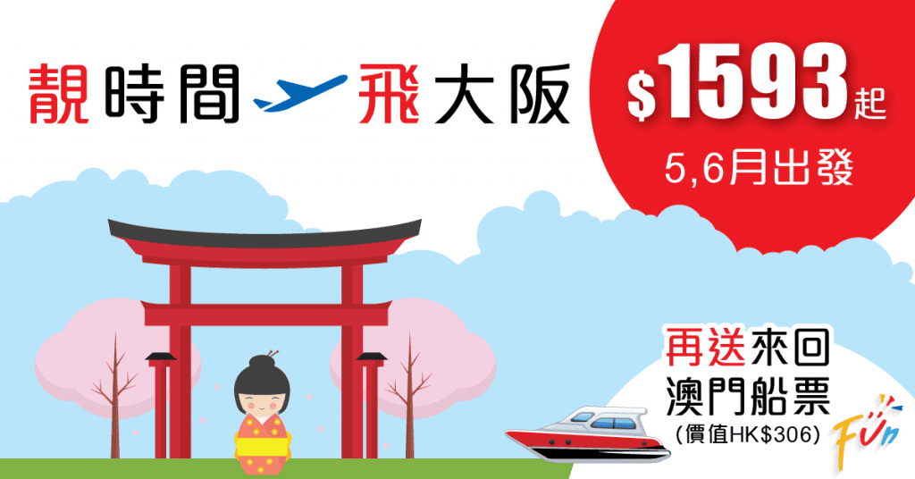 又有大阪平機票啦,Funfun.travel推出左香港航空飛大阪預留機位優惠