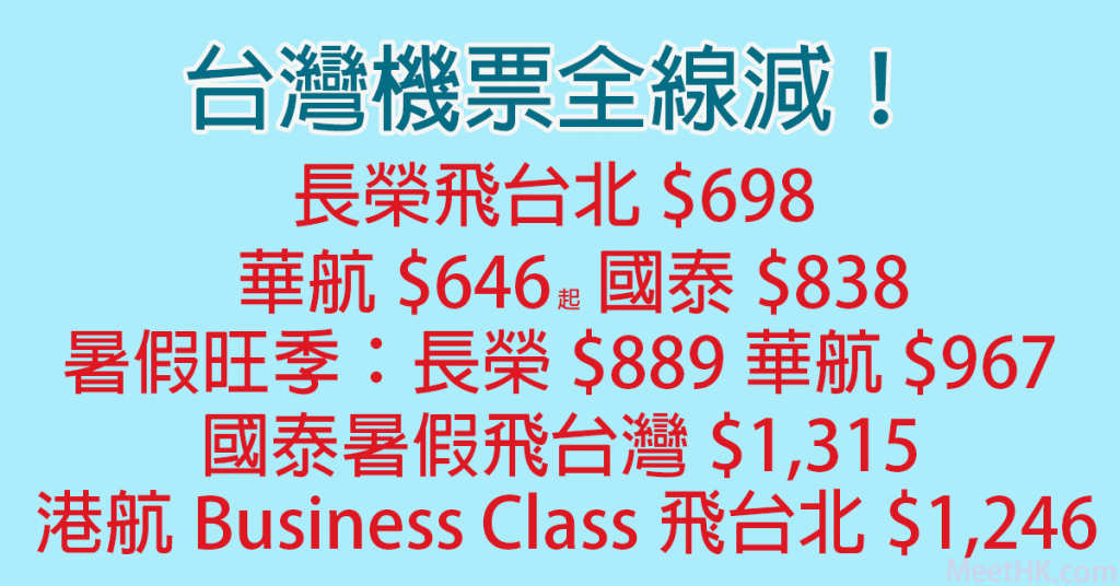 台灣機票全線減!長榮賣到下年2月!長榮飛台北$698,華航飛台灣$646起,國泰飛台灣$838,長榮暑假飛台北$889,華航暑假飛台灣$967,國泰暑假飛台灣$1,315;港航Business Class飛台北$1,246 – Wefly.com.hk (優惠至4月30日)