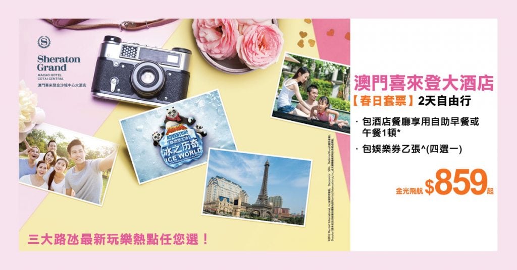 春日驚喜!澳門喜來登金沙城中心大酒店2日1夜套票(酒店連船飛)每人只需$859起,包自助早餐或午餐,兼送娛樂劵(4選1) – 永安旅遊