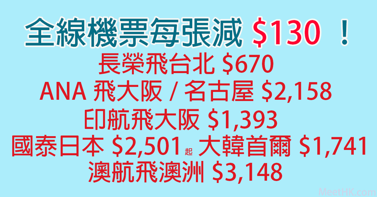 全線機票每張減$130!長榮飛台北$670,ANA飛大阪/名古屋$2,158,印航飛大阪$1,393,國泰飛日本$2,501起,大韓飛首爾$1,741、澳航飛澳洲$3,148 – Wefly.com.hk (優惠至4月29日)