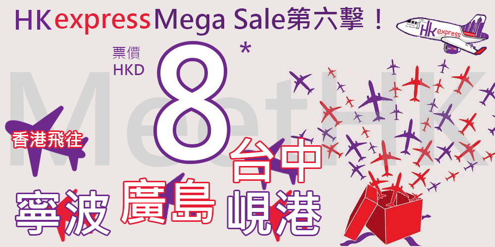 嘩嘩嘩!八蚊雞Mega Sale第六擊!日日迫你飛!今晚12點必搶!廣島、台中、峴港、寧波單程只需$8 – HK Express (優惠至5月1日)