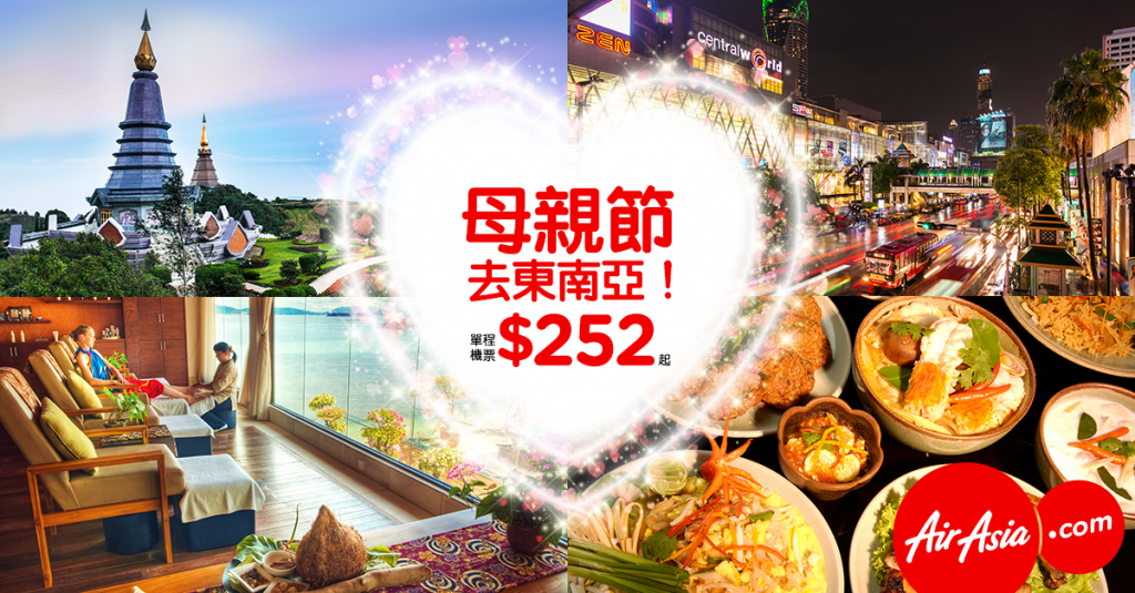 母親節俾媽咪一個驚喜!香港飛沙巴來回連稅$919起、清邁$956起、吉隆坡$1,021起、布吉$1,036起、曼谷$1,096起、馬爾代夫$2,521起 – AirAsia (優惠至5月8日)