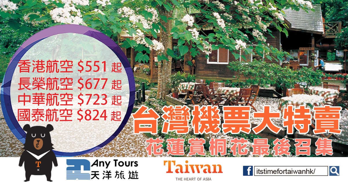 花蓮賞桐花最後召集!港航飛台北$551,長榮飛台北$677,華航飛台灣$727起,國泰飛台灣$824 – Any Tours天洋旅遊