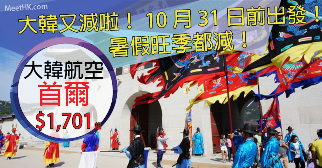 大韓又減啦!10月31日前出發!香港往返首爾只需$1,701起(淡季),$2,297(暑假旺季) – 大韓航空 (優惠至5月31日)