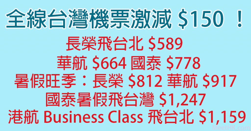 力度加碼!全線台灣機票激減$150!全年優惠!長榮飛台北$589,華航飛台灣$664,國泰飛台灣$778,長榮暑假飛台北$812,華航暑假飛台灣$917,國泰暑假飛台灣$1,247;港航Business Class飛台北$1,159 – Wefly.com.hk (優惠至5月10日)