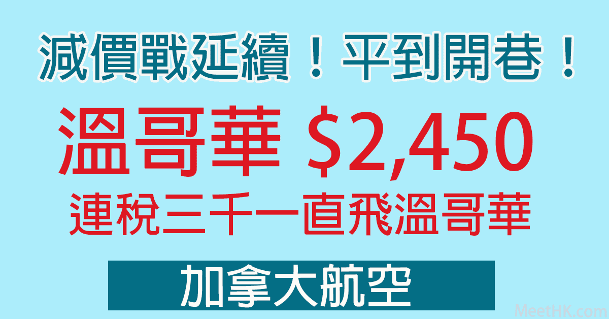 嘩!減價戰延續!平到開巷!加航新低!香港往返溫哥華只需$2,450 – 加拿大航空 (優惠至5月15日)