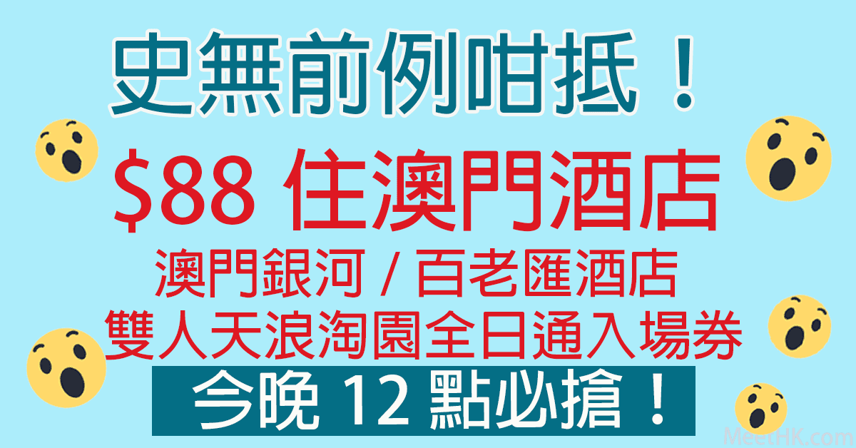 大家可以用$88震撼價預訂天浪淘園全日通二人套票,加送當晚入住澳門銀河/百老匯酒店,史無前例咁抵!