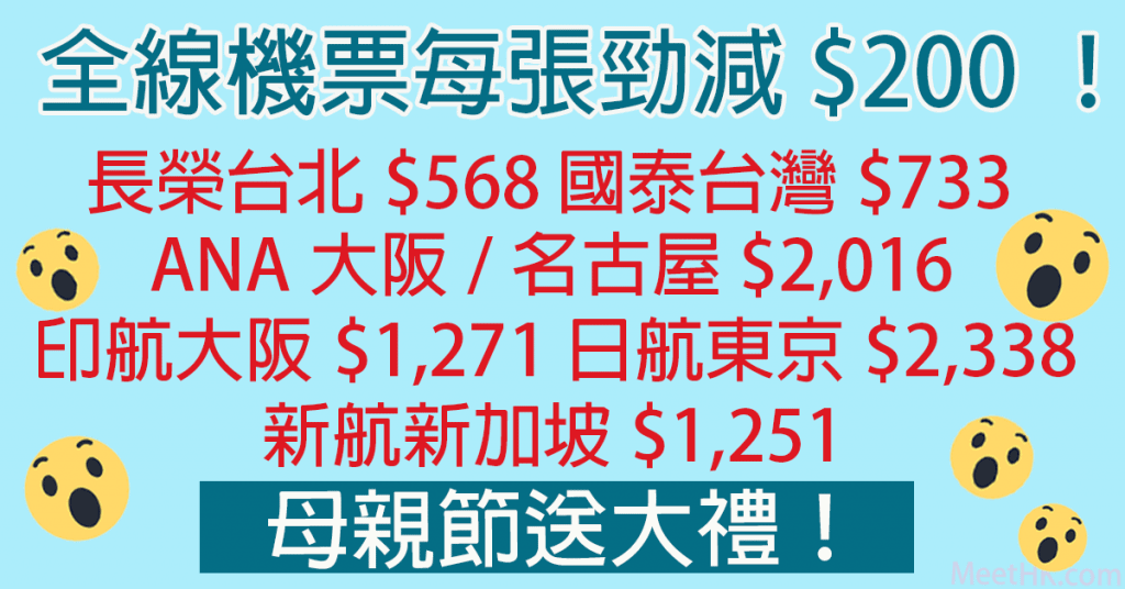 抵呀!母親節送大禮!只限24小時!全線機票每張勁減$200!長榮飛台北$568,國泰飛台灣$733,印航飛大阪$1,271,日航JAL飛東京$2,338,ANA全日空飛大阪/名古屋$2,016,新航飛新加坡$1,251 – GoGoGo!(優惠至5月14日)