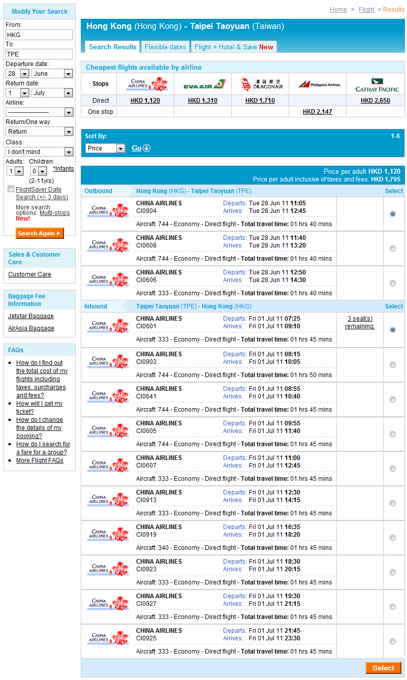 我們以6月28日去7月1日回試了一下,時間選擇非常多,可以早機去晚機返
