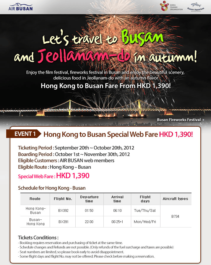 優惠適合10月1日至11月30日期間出發,正正適合去欣賞紅葉美景,另外首一百位買飛既朋友更可獲得釜山水族館(Busan Aquarium)門票