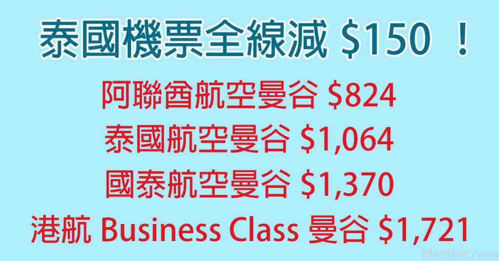 泰國機票全線減$150!全年優惠!曼谷$824起(阿聯酋航空),$1,064(泰航),$1,370(國泰),港航Business Class飛曼谷$1,721 – Wefly.com.hk (優惠至5月20日)