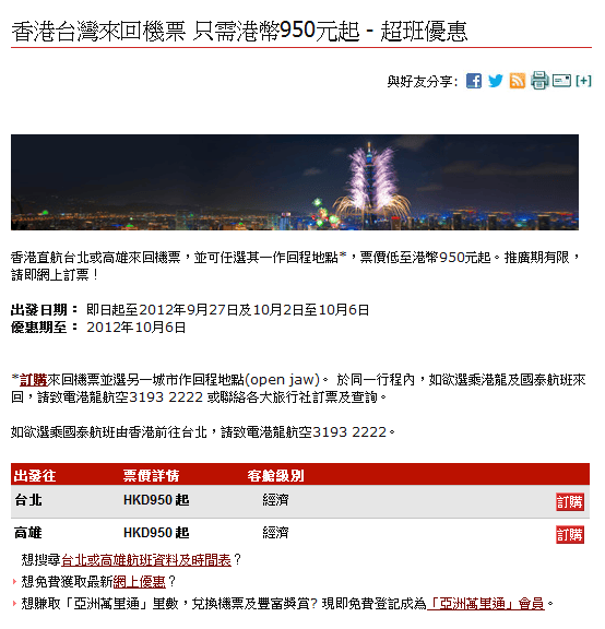 其實呢個國泰、港龍台灣Last Minute優惠,台北部份我地星期一既時候已經寫過,不過當時高雄未有優惠,同埋官網未有得定