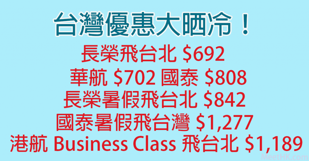 台灣優惠大晒冷!長榮賣到下年3月!長榮飛台北$692,華航飛台灣$702起,國泰飛台灣$808,長榮暑假飛台北$870,國泰暑假飛台灣$1,277;港航Business Class飛台北$1,189 – Wefly.com.hk (優惠至5月24日)