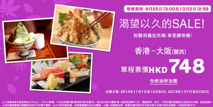 又有優惠!25/9 1pm開賣!香港往返大阪單程只需$748 (不另收燃油費) – 樂桃航空 (優惠至10月2日12:59pm)
