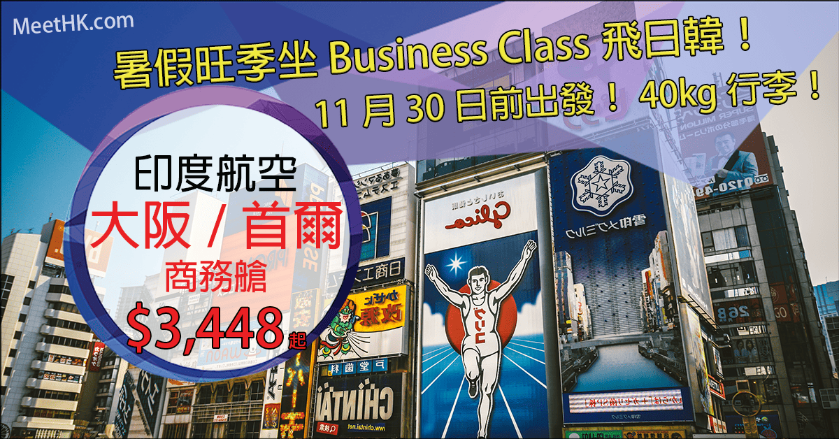 抵呀!暑假旺季坐Business Class飛日韓!11月30日前出發!40kg行李!香港往返大阪、首爾商務艙只需$3,448起 – 印度航空 (優惠至5月31日)