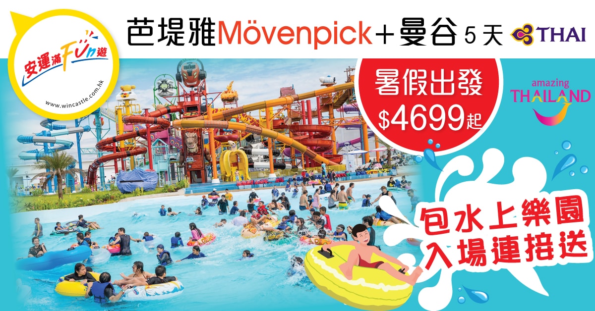 暑假坐泰航親子遊泰國!芭堤雅Movenpick +曼谷5天套票連水上樂園入場$4,699起,華欣Hyatt Regency Hua Hin5天套票 $4,999起 – 安運滿Fun遊