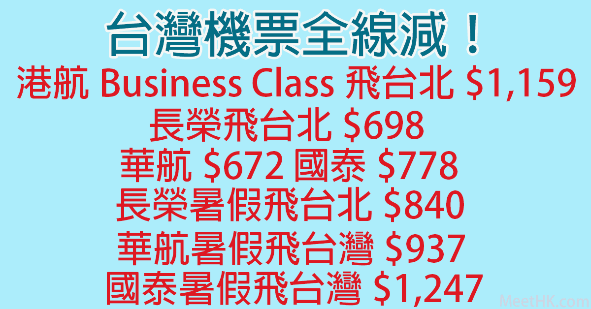 台灣機票全線減!港航Business Class飛台北$1,239!經濟艙:長榮飛台北$698,華航飛台灣$672起,國泰飛台灣$778,長榮暑假飛台北$840起,華航暑假飛台灣$937,國泰暑假飛台灣$1,247 – Wefly.com.hk (優惠至5月31日)