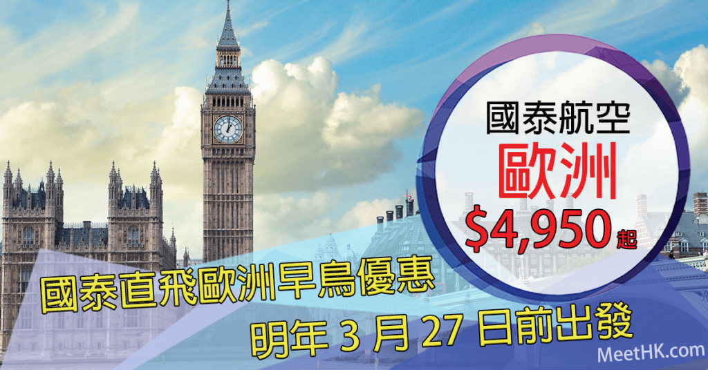 國泰直飛歐洲早鳥優惠!明年3月27日前出發!香港直航往返歐洲各地只需$4,950起 – 國泰航空 (優惠至6月30日)