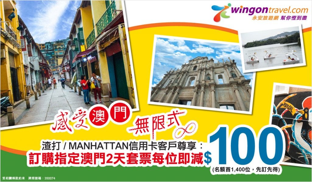 渣打/ MANHATTAN信用卡指定澳門無限式2天套票每位減$100推廣碼:BC759 (每單最高可減$200)