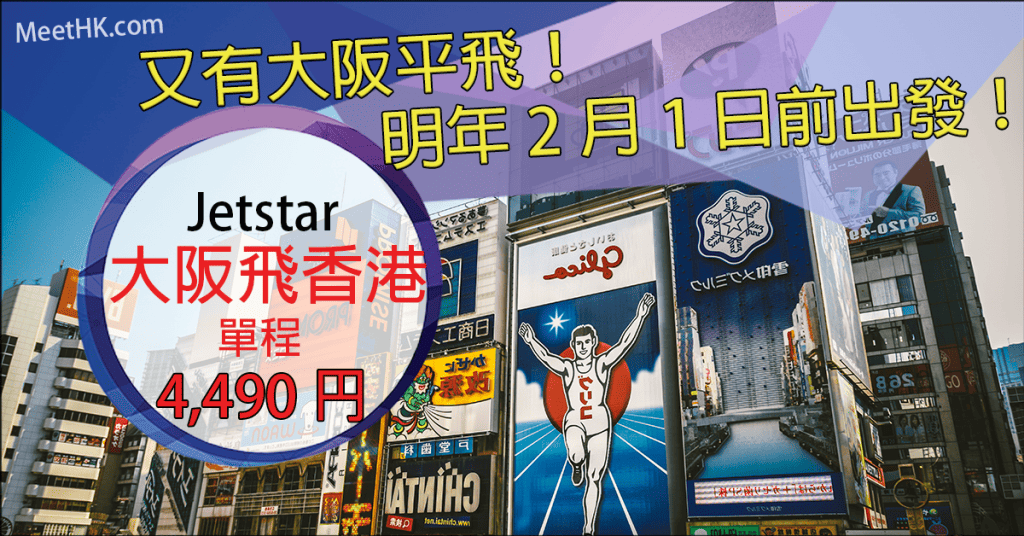 明天5pm開賣!明年2月1日前出發!大阪飛香港單程只需4,490円 – Jetstar Japan (優惠至6月12日)