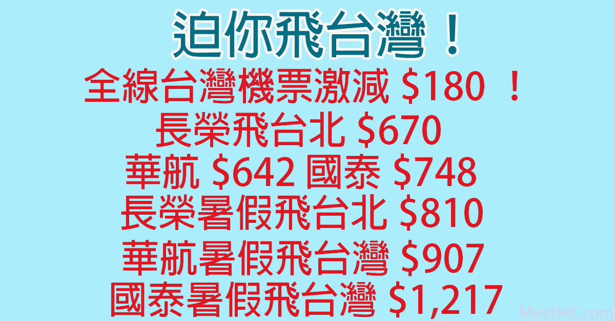 迫你飛台灣!全線台灣機票激減$180!全年優惠!長榮飛台北$670,華航飛台灣$642,國泰飛台灣$748,長榮暑假飛台北$810,華航暑假飛台灣$907,國泰暑假飛台灣$1,217 – Wefly.com.hk (優惠至6月14日)