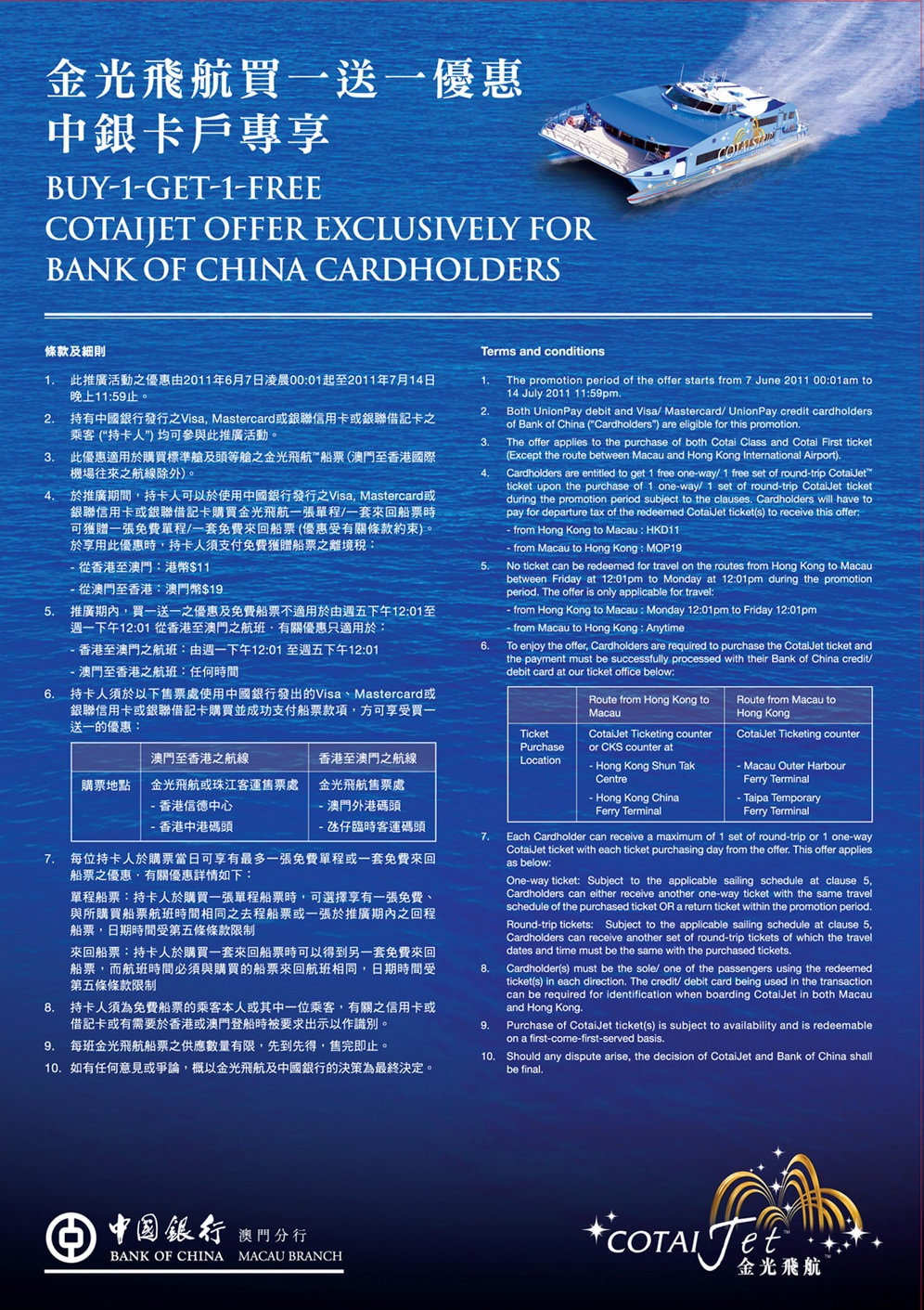 金光飛航又推出新優惠啦! 由即日起至7月14日, 中銀卡戶(所有中國銀行發行之Visa, Mastercard或銀聯信用卡或銀聯借記卡) 均可享有優惠專享船票買一送一優惠! 持卡人於購票當日購買一張單程/來回船票, 即可獲贈一張免費單程/免費來回船票。 航班時間適用於(香港至澳門) 週一下午12:01至週五下午12:01, (澳門至香港) 任何時間。有關詳細的條款及細則, 請參閱以下海報。