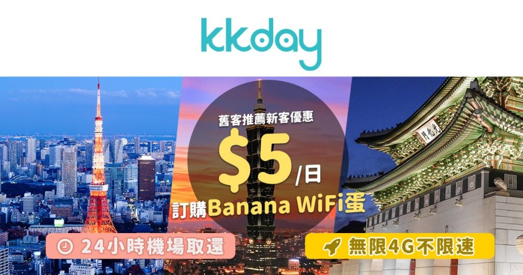 嘩!$5 $5 $5 Wi-Fi蛋!日韓台Wi-Fi蛋每日$5!KKday現有會員推薦朋友成為新會員即享優惠;日本JR Pass 加碼優惠滿$100減$10(如此類推) – KKday