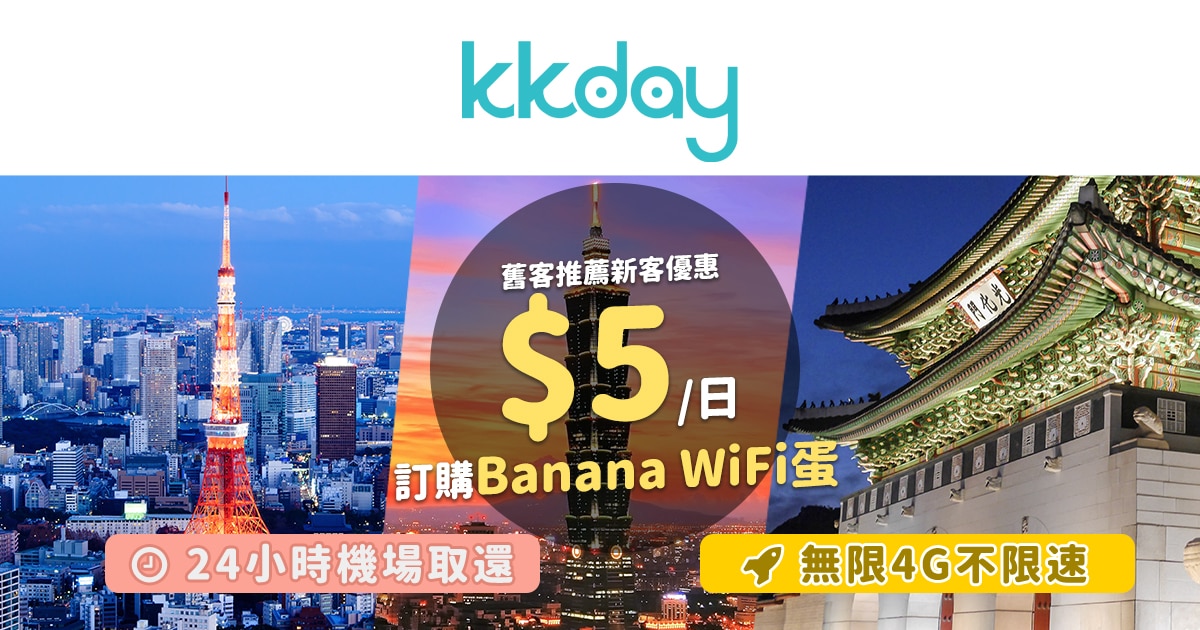 KKday現有會員推薦朋友成為新會員即可以優惠價$5/日租用Banana日韓台 Wi-Fi蛋