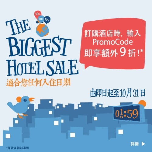 ZUJI 網上酒店預訂折扣代碼:HKBiggestOCT12 (10月31日前預訂有效)