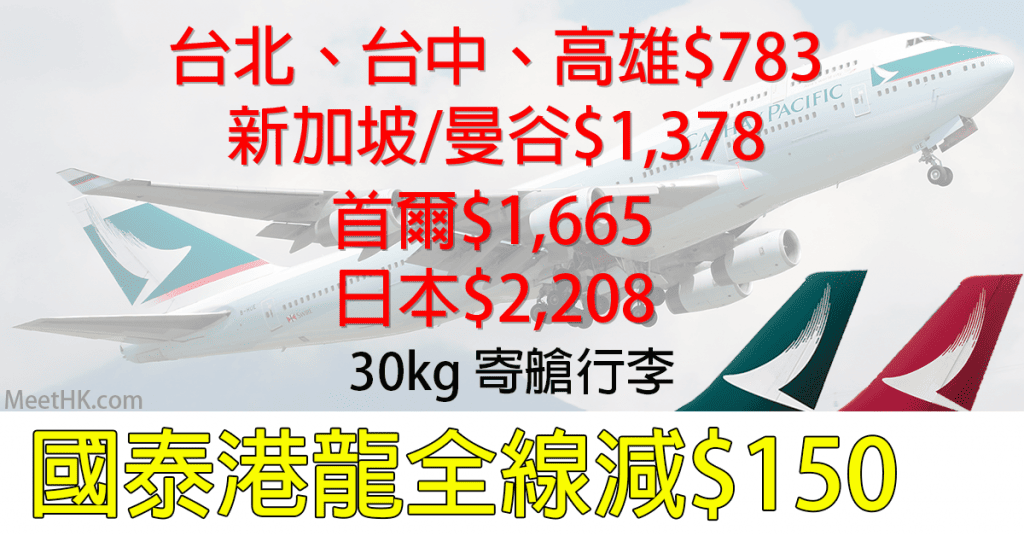 國泰/港龍全線減$150!30kg行李!台灣$783,新加坡/曼谷$1,378,首爾$1,665,日本$2,208起 – GoGoGo!(優惠至6月25日)