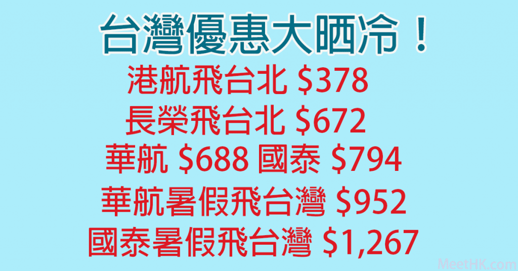 台灣優惠大晒冷!連稅八百三飛台北!港航飛台北$378,長榮飛台北$672,華航飛台灣$688起,國泰飛台灣$794起,華航暑假飛台灣$952,國泰暑假飛台灣$1,267 – Wefly.com.hk (優惠至6月28日)