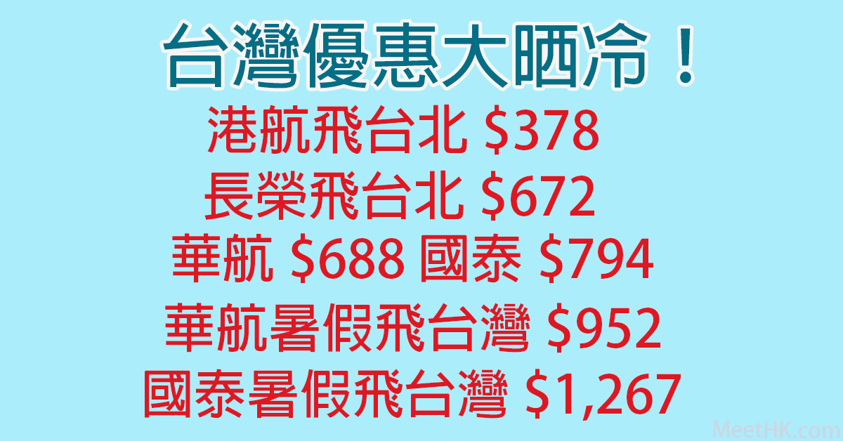 台灣優惠大晒冷!連稅八百三飛台北!港航飛台北$378,長榮飛台北$672,華航飛台灣$688起,國泰飛台灣$794起,華航暑假飛台灣$952,國泰暑假飛台灣$1,267 – Wefly.com.hk (優惠至6月28日)